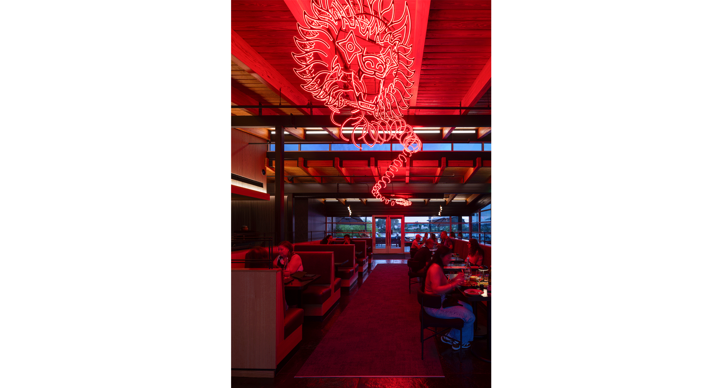 The material palette emphasizes contrast and warmth, using natural wood, blackened steel, and concrete to establish visual rhythm. Lighting is layered to support both daytime openness and evening intimacy. A custom neon dragon installation traces the ceiling of the main dining area, introducing a dramatic visual anchor that reflects the restaurant’s cultural inspiration and brand identity.